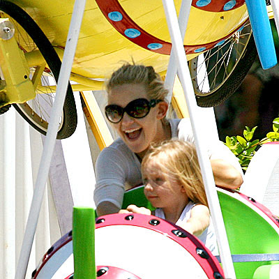 Kate Hudson seems to be having a lot more fun at the kiddie-park than her son Ryder. Maybe Ryder's in a bad mood because everyone keeps thinking he's a girl. Cut the kid's hair, Kate. Either that or give him some of what you're taking.