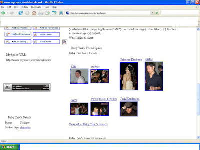 So what mysterious point was Paris trying to prove and keep? Some personal thing between her and her friends. Yes - and it conveniently explains why there's almost nothing on the page. Cause Paris wasn't really into the whole MySpace thing - it's overrated, and she was just proving a point. Or, was the page set up as a dummy by some "hacker" who was trying to make it look like Paris was conversing with Lohan? And this "hacker" just didn't want to go to the trouble to produce a convincing page, so he made up some bullshit about how Paris was only "proving a point" by having the barebones profile. Sorry - Paris Hilton doesn't set up a public MySpace account, then leave it plain, and have only 9 friends. And then go to the trouble of blocking the pictures and the Friends section? Why? Cause she's suddenly this private person? Sorry, but it's too easy for a person to set up a bunch of fake MySpace accounts under the names of famous people, then concoct some phony conversations. And maybe a few of Paris's alleged friend-links actually take you to the profiles of the real celebs - big deal. Crabbie's friended Cory Kennedy, Tori Spelling and Brody Jenner - cause people like that approve every friend-request - or have the person who keeps up the page for them do it - without bothering to check. Any idiot can friend a bunch of celebs. It surprises me, actually, that the hacker didn't friend a bunch more people just to make his fake Paris profile convincing. But, then he did hide the Friends section. But why have anything at all in it, you ask? Because he knew someone would know how to unblock it, so he had to have something in there just in case? Sorry - it's all fake. Much as I'd like to believe it's real, I can't.