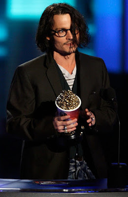 Johnny Depp provided probably the coolest moment at last night's MTV Movie Awards, when he unexpectedly came out on-stage to accept his award for Best Performance (for Pirates of the Caribbean: Dead Man's Chest). The crowd really cheered him too. Because they love him, and with good reason - he's a true performer who uses his talent to bring happiness and fun into people's lives. Unlike that piece of shit Paris Hilton who has nothing whatsoever to offer. The gulf between the reactions those two got from the crowd last night pretty much sums up the difference between earned celebrity and the fake kind people like Hilton possess.