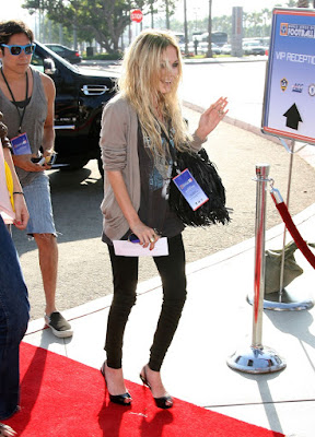 Mary-Kate Olsen arrives for David Beckham's debut soccer game at The Home Depot Center. Who knew Mary-Kate was a sports fan? All right, she's not. She was driving by and saw the red carpet, and whenever she sees one she has to walk it. If you wanted to kill the bitch, all you would have to do was make a long red carpet leading to the edge of a cliff...