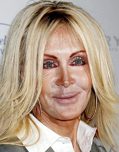 Joan Van Ark. Wow. What can one say? Let this be a lesson to anyone who thinks plastic surgery can allow you to beat the aging process. Seriously - she looks like she dipped her head into a vat of acid, burning all the skin and flesh off, then painted her face sort of flesh-colored (but a bit silvery like she suddenly wanted to be the Tin Man) and threw on a wig. And popped in a couple bloodshot glass eyes for good measure. Bitch should start her own freak-show, with herself as the main attraction.
