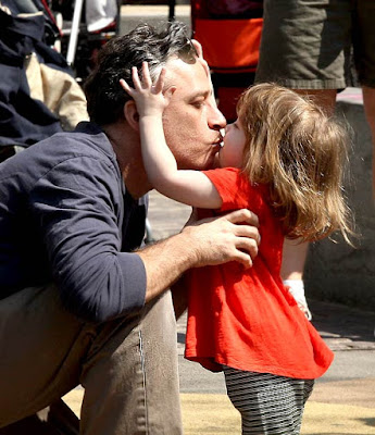 gives his little daughter Maggie a monkey-kiss. This was taken at a playground. Dear God...tell me Jon Stewart isn't going to become the short, hairy, Jewish Jennifer Garner. Gaaaaaaaaa!