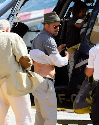 Brad Pitt took a couple of the kids for a helicopter ride in France, and while doing so, the breeze from the chopper blades blew up the back of his shirt to reveal these weird-ass tattoos.