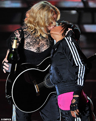 Madonna sucked face with one of her background singers at a show. For a second there I thought it was Rihanna. It's sad that Madonna thinks anyone is still titillated by this shit. No one's cared about on-stage lesbian kisses since that little Russian girl pop duo went through.
