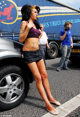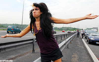 Who says Amy Winehouse can't deal? Here the nutty pop-star gets stuck in traffic...and does she go off? Hell no. She simply gets out of her vehicle, and begins hitting up other motorists for a light. Then when she gets bored she lifts her shirt and suns her belly. She's an example to us all.
