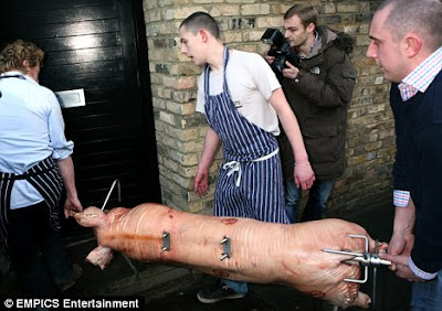 That's how I wanna go...with a metal shaft up my ass. The pig was being delivered to